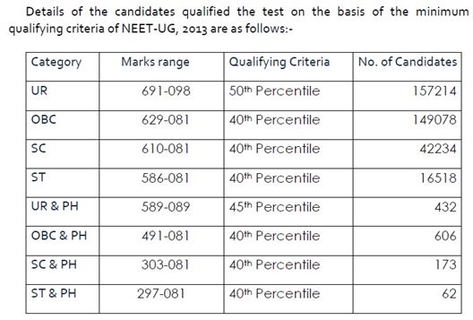 Estimated details of Candidates qualified the test on the basis of the minimum qualifying criteria of NEET UG 2013 is given here